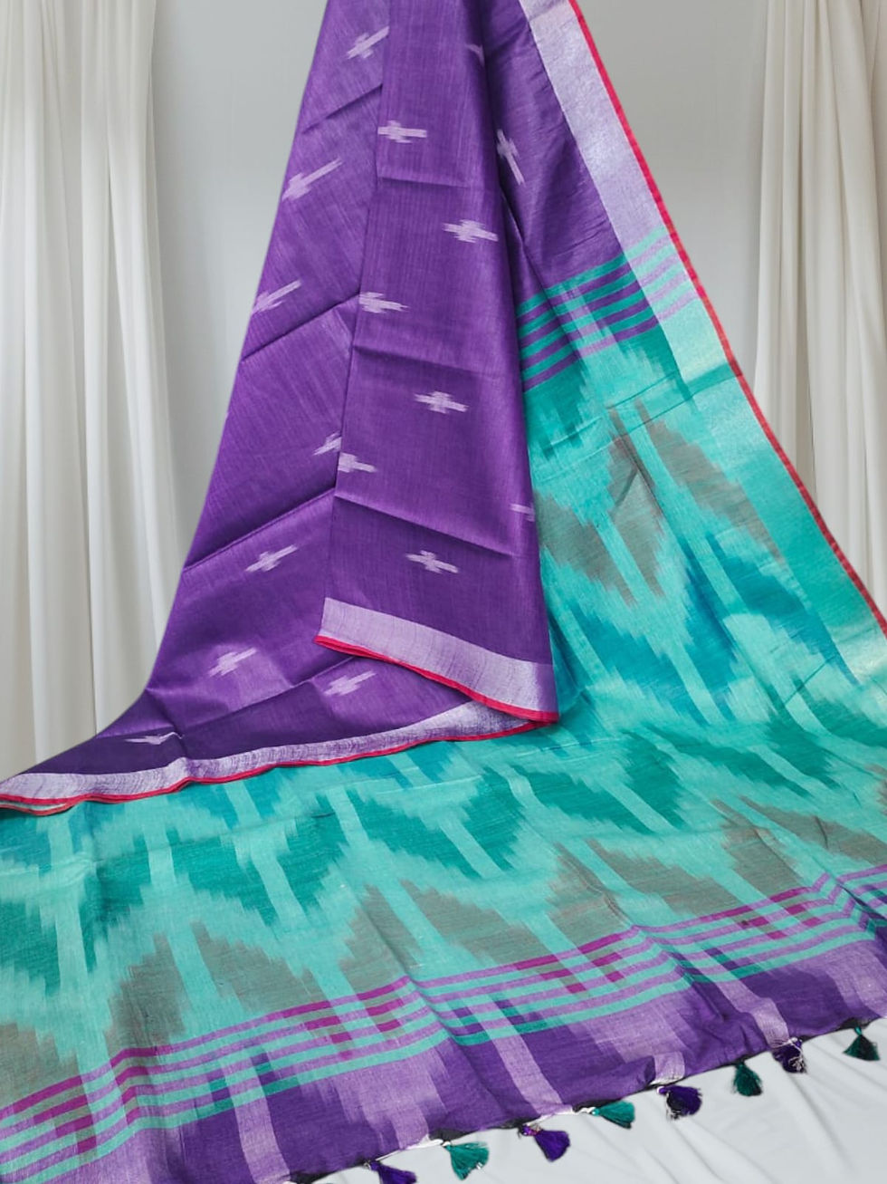 Linen Cotton Ikkat Saree | Sky Blue & Pink